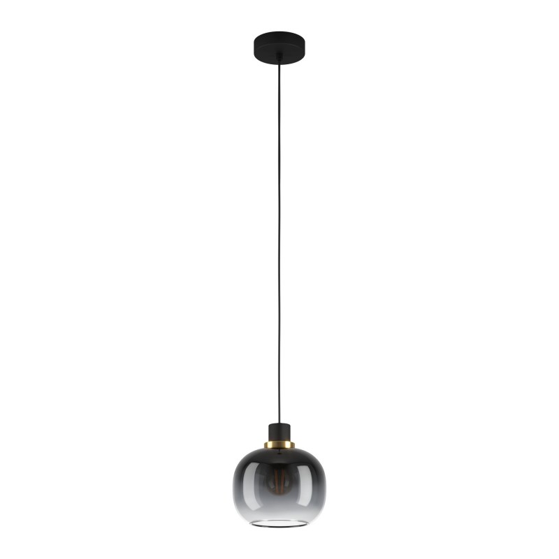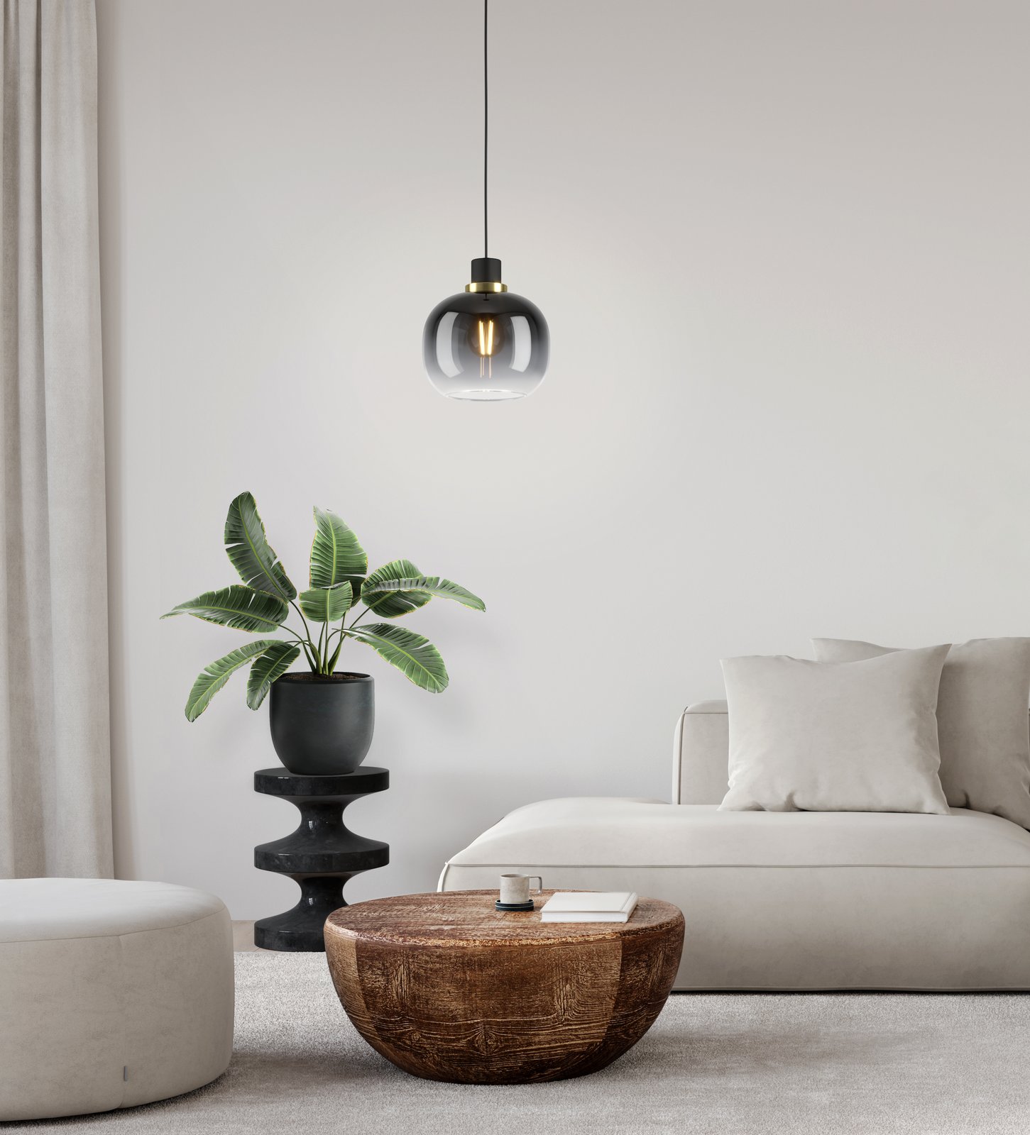 Nowoczesne lampy wiszące Oiella nadają się do kuchni i jadalni, ale także do salonów. Podstawa wykonana jest ze stali w kolorze czarnym i mosiądzu, a klosz ze szkła w kształcie kuli. |