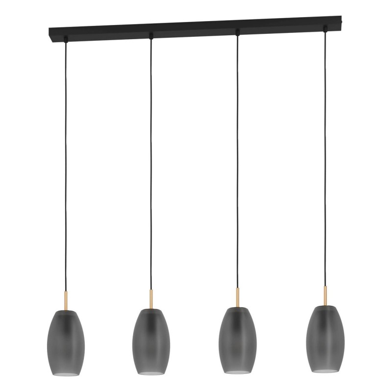 Moderne Kronleuchter aus Stahl in schwarzer Farbe, Lampenschirme aus Glas in mattgrauer Farbe mit einem Messingelement. Sie eignen sich besonders für Küchen und Esszimmer, über dem Esstisch oder der Kücheninsel.