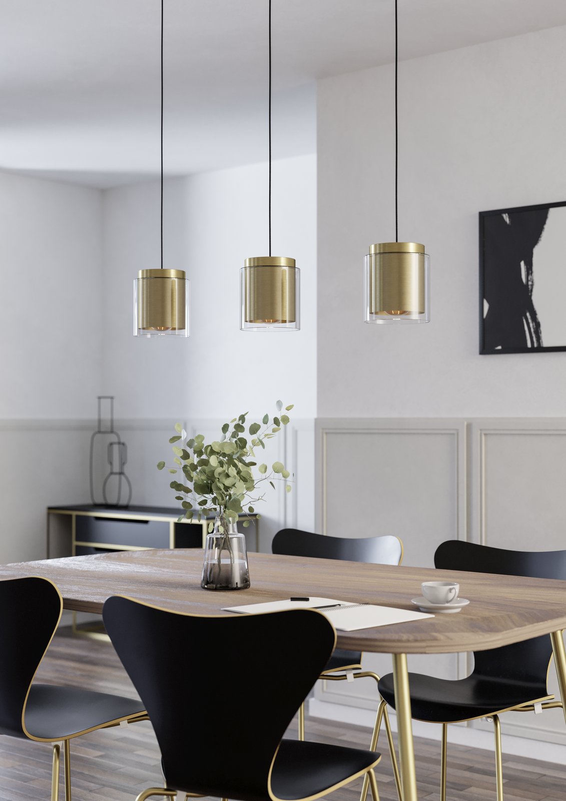 Moderne Pendelleuchten geeignet für Wohnzimmer, Küchen über der Kücheninsel und Esszimmer über dem Esstisch. Der Sockel besteht aus Stahl in schwarzer Farbe, das Scharnier aus Stahl in Messing- und Goldfarbe und aus Glas in klarer Farbe. |