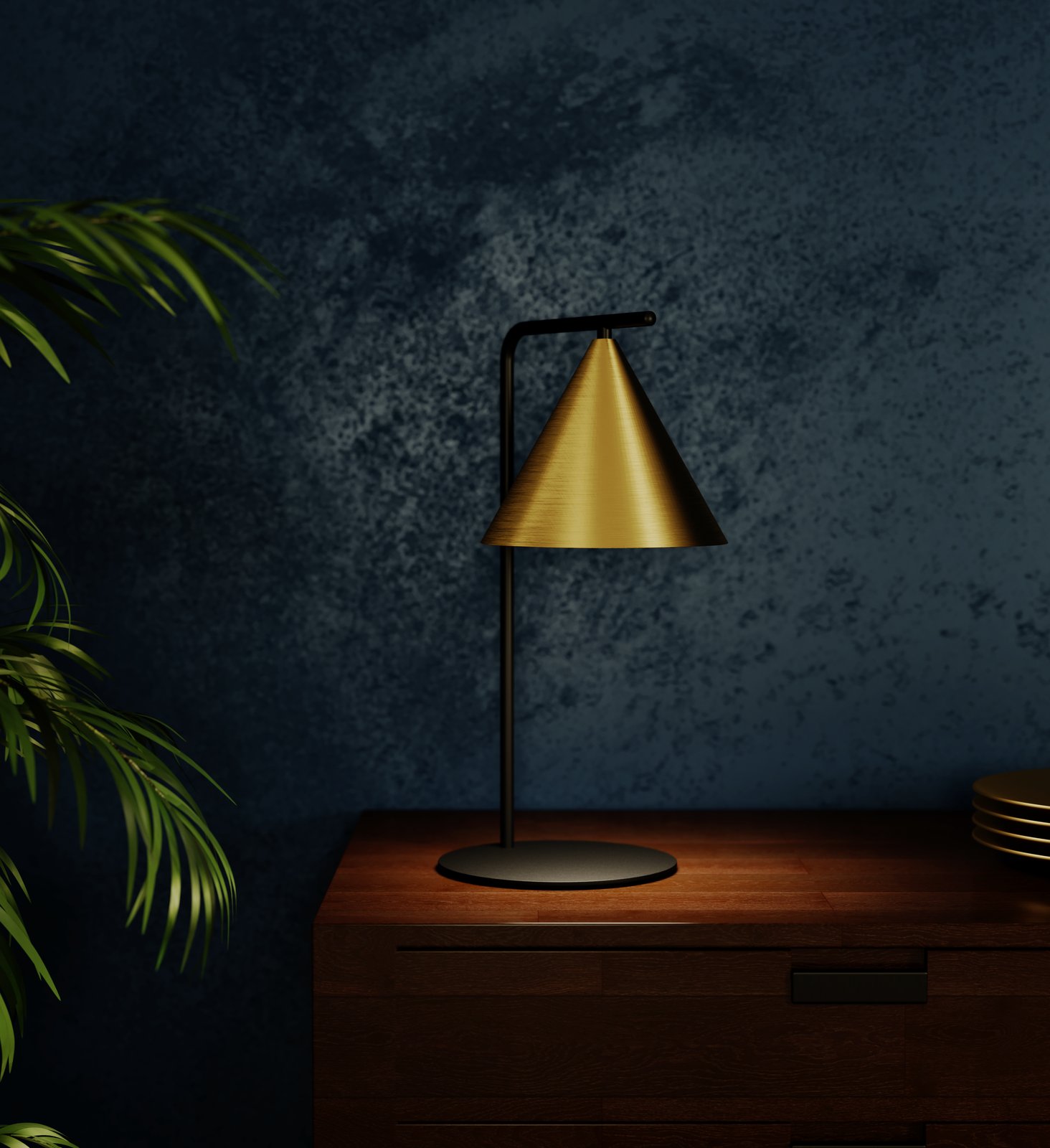 Eine stilvolle und moderne Lampe und Tischlampe als interessantes Element für Ihr Interieur. Das Bein der Lampe besteht aus schwarzem Stahl und der Schirm aus Stahl in einer Kombination aus Messing- und Goldfarben. |
