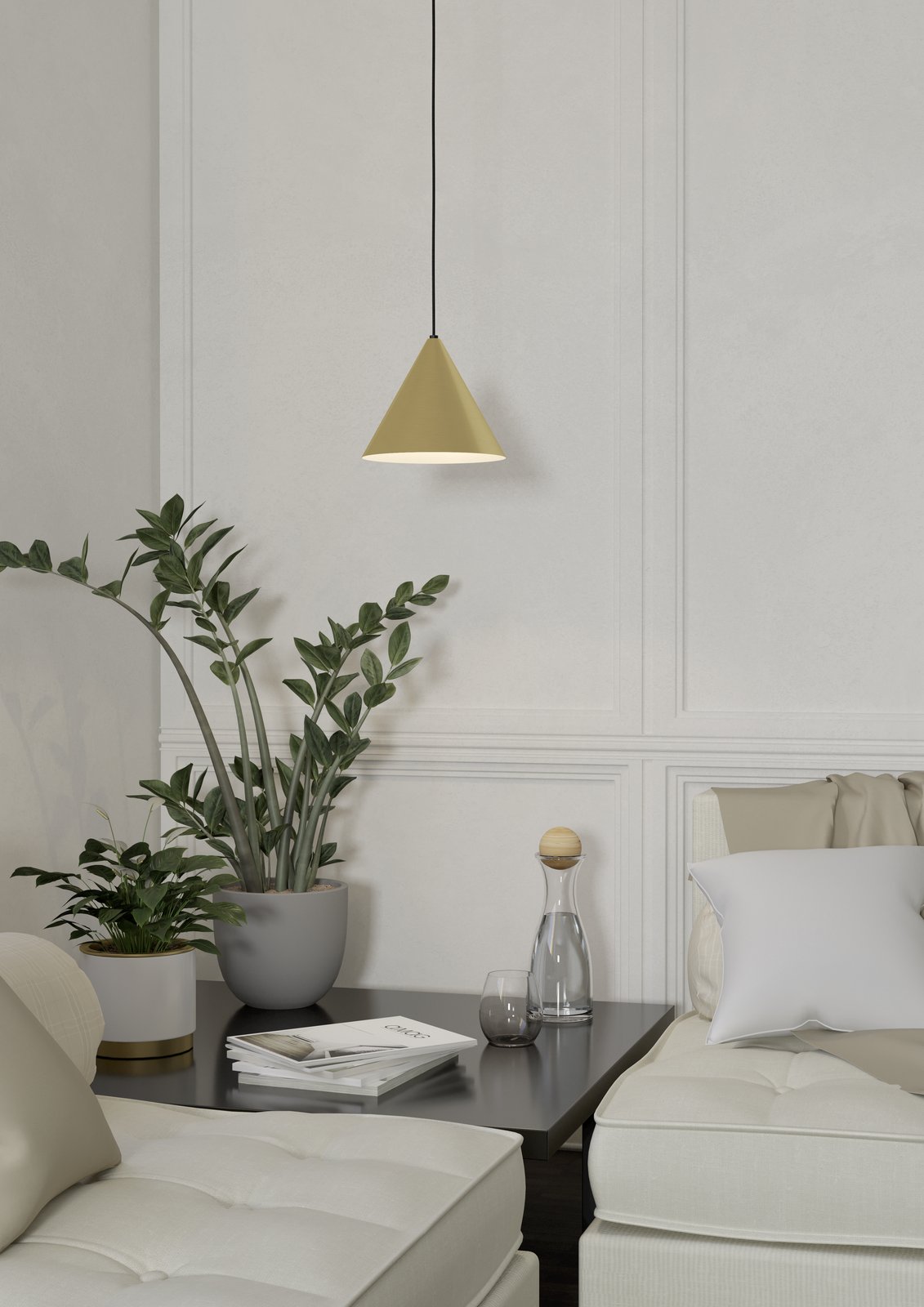 Moderne und stilvolle Kronleuchter für Küchen und Esszimmer, aber auch für Wohnzimmer. Sie bestehen aus Stahl in schwarzer Farbe und der Schirm besteht aus Stahl in einer Kombination aus Messing und Gold.