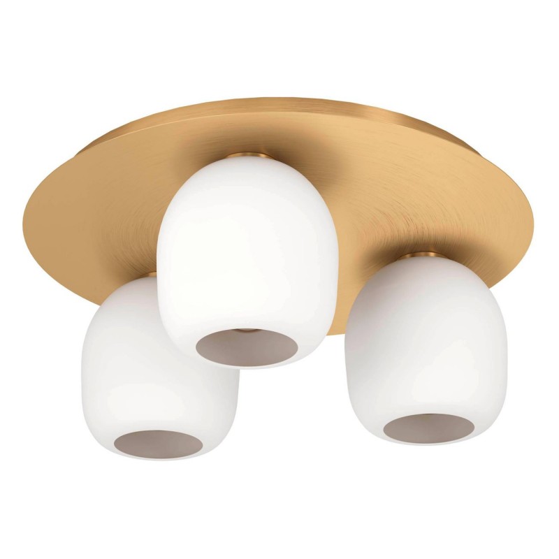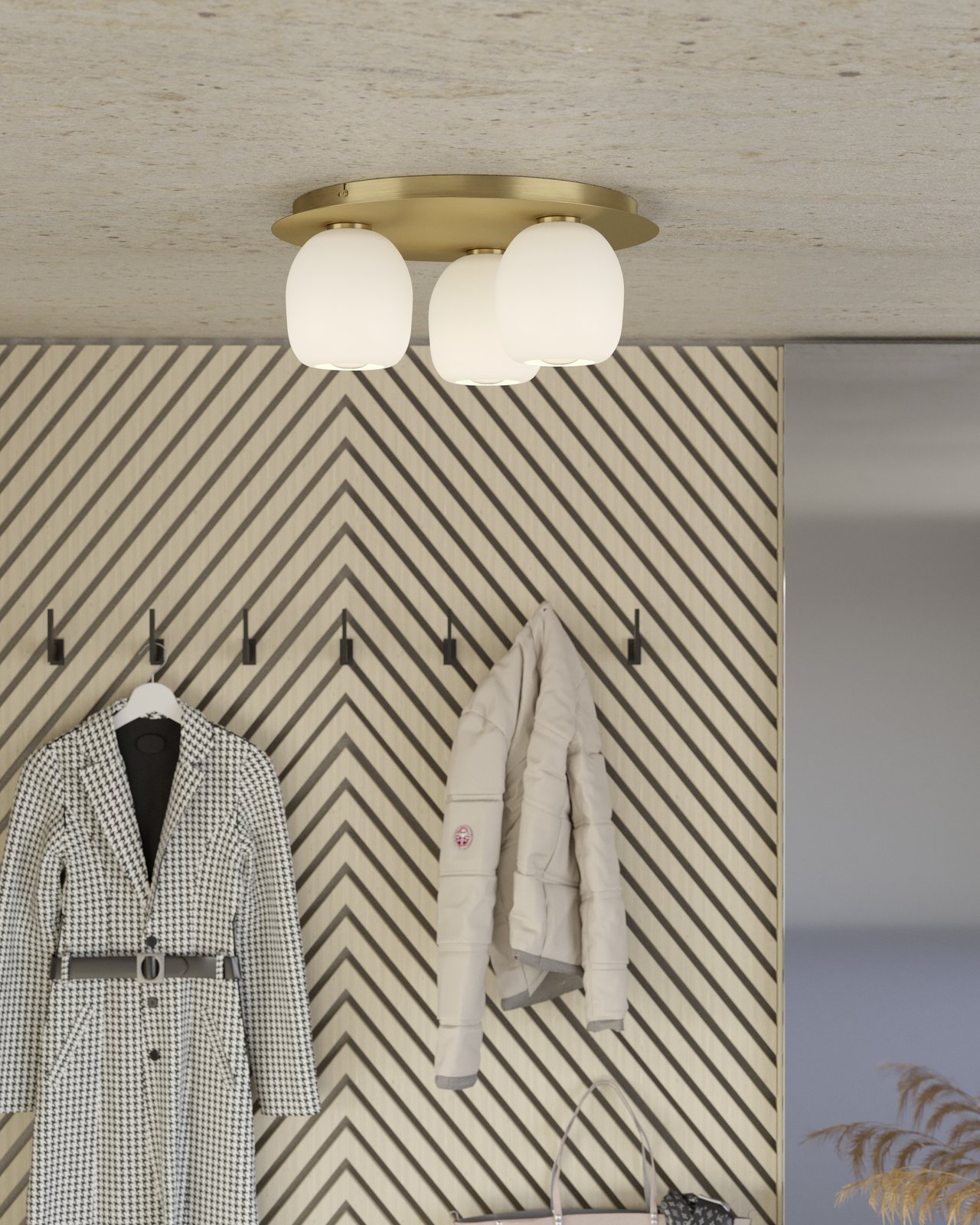 Interessante Lampen aus Stahl in den Farben gebürstetes Messing und Gold und aus mattem Opalglas. Sie eignen sich für Wohnzimmer, Küche, Esszimmer, Schlafzimmer und Flur.