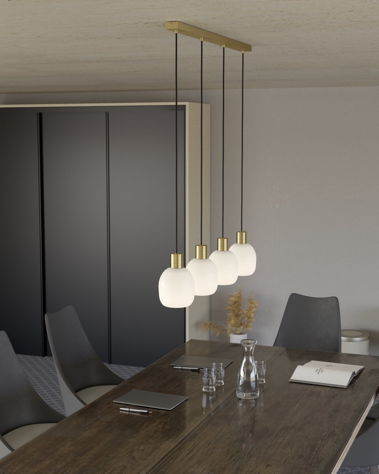Interessante Lampen aus Stahl in den Farben gebürstetes Messing und Gold und aus mattem Opalglas. Sie eignen sich für Wohnzimmer, Küche, Esszimmer, Schlafzimmer und Flur. |
