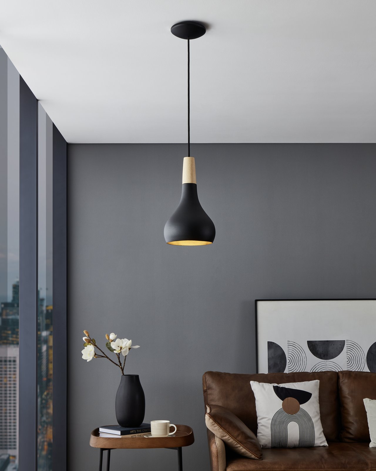 Moderne Sabinar-Pendelleuchten bestehen aus schwarzem Stahl mit einem braunen Holzelement. Sie haben ein schlichtes, klares Design, die schwarze Farbe verleiht ihnen ein elegantes Aussehen und macht sie zu einer idealen Wahl für Ihre Inneneinrichtung. |