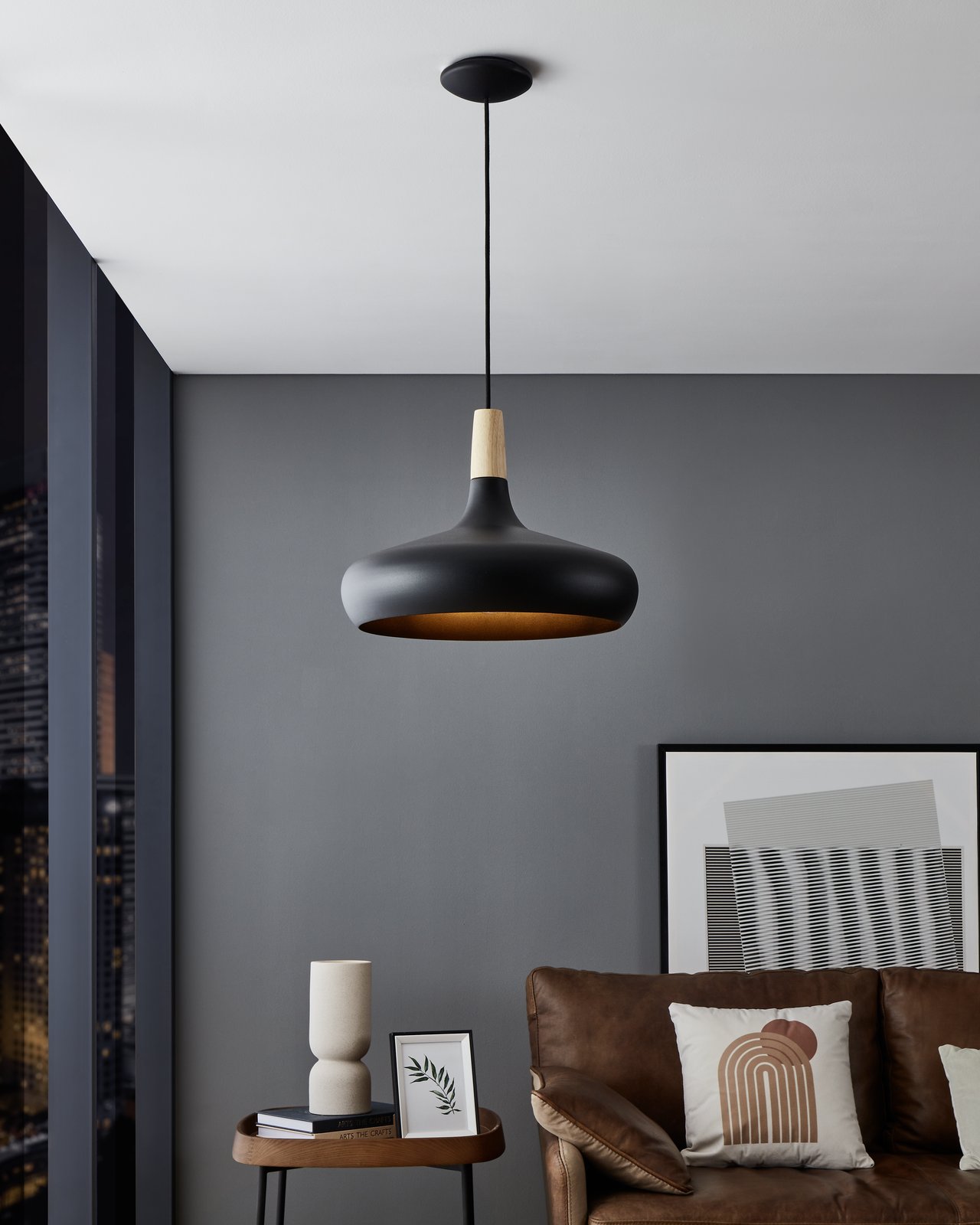 Moderne Sabinar-Pendelleuchten bestehen aus schwarzem Stahl mit einem braunen Holzelement. Sie haben ein schlichtes, klares Design, die schwarze Farbe verleiht ihnen ein elegantes Aussehen und macht sie zu einer idealen Wahl für Ihre Inneneinrichtung. |