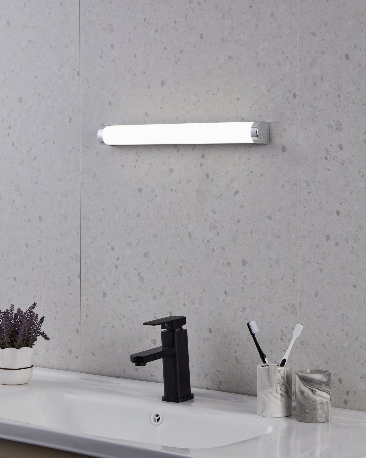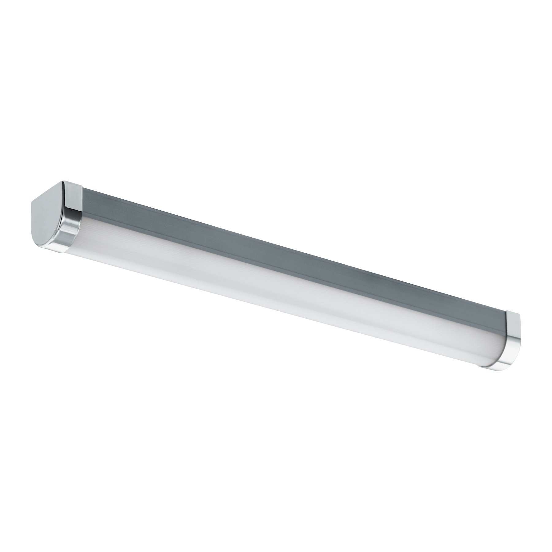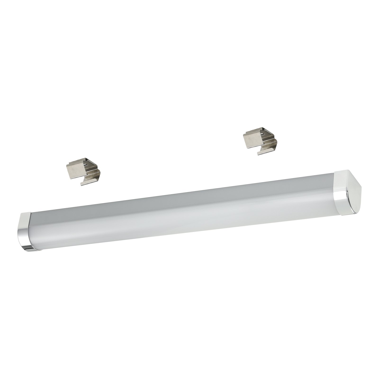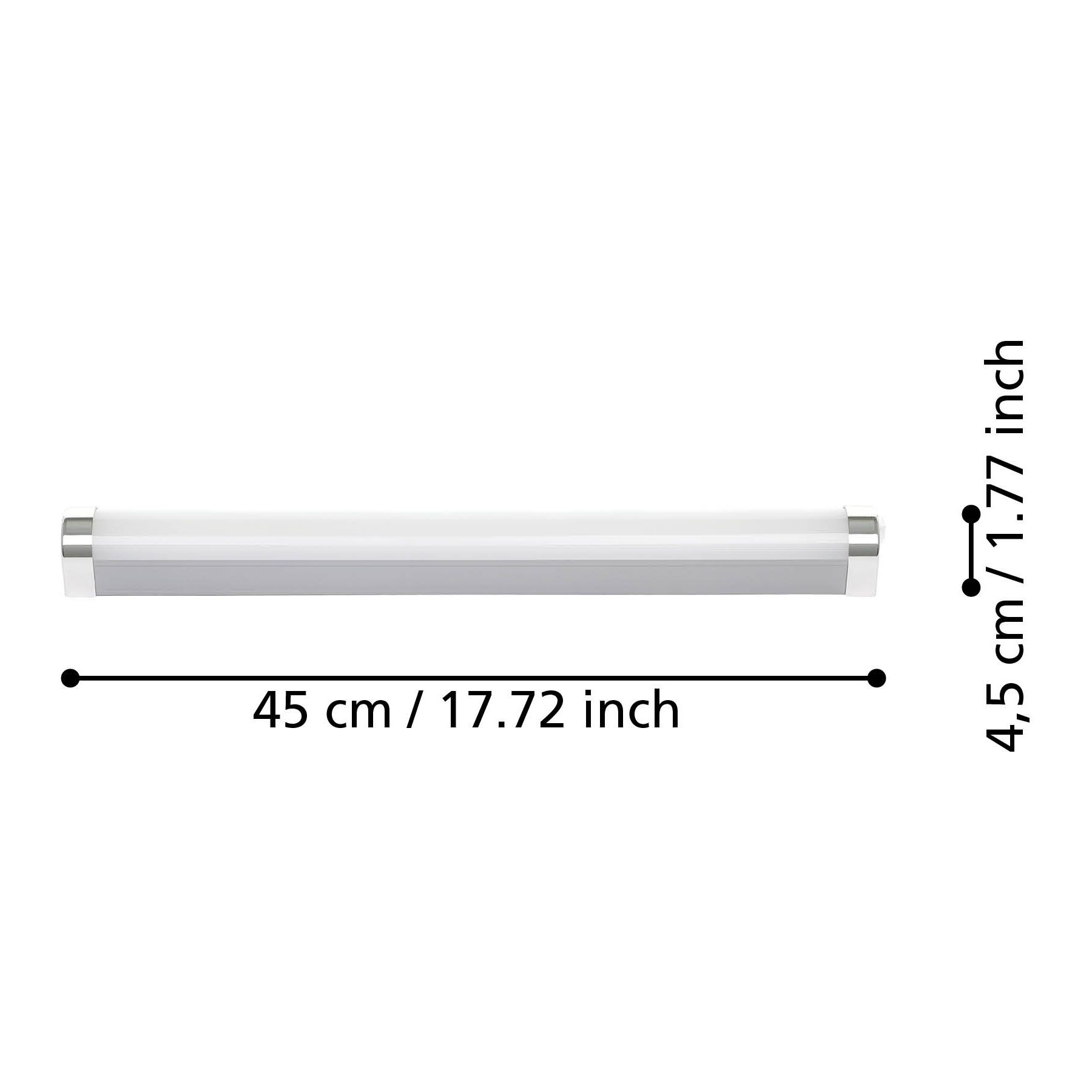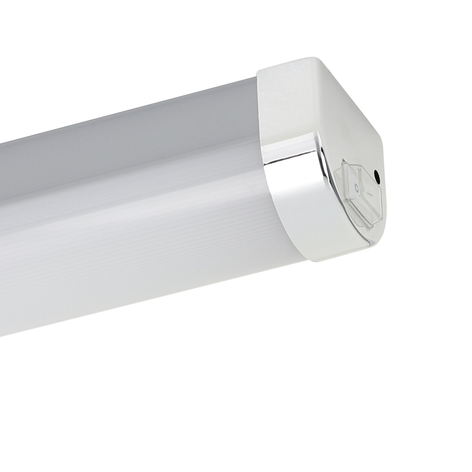 Wandleuchte für Badezimmer, geeignet über Spiegeln. Es besteht aus Kunststoff und Stahl in Silber und Chrom sowie Kunststoff in Weiß. Sie erstrahlt in einem neutralen Weiß und ist nicht dimmbar. Die Lampe verfügt über einen Schalter zum einfachen Einschalten.