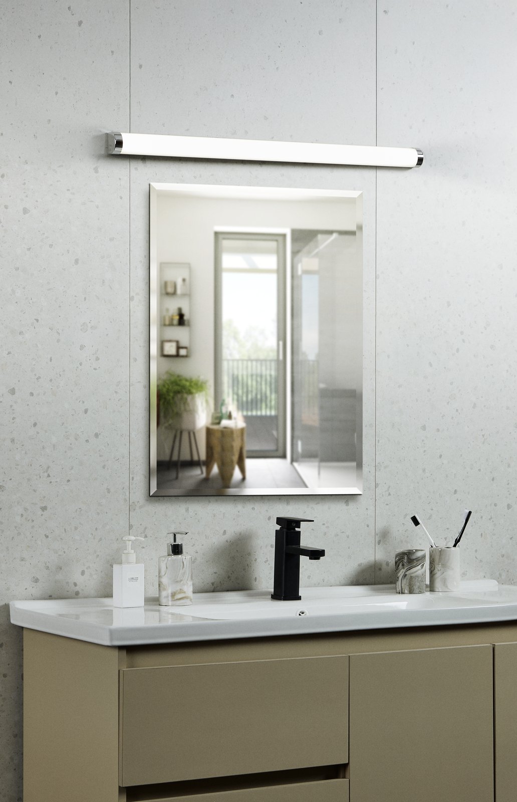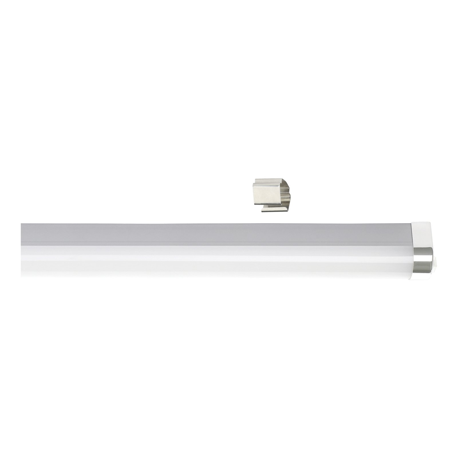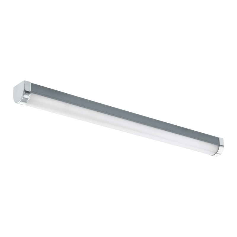 Wandleuchte für Badezimmer, geeignet über Spiegeln. Es besteht aus Kunststoff und Stahl in Silber und Chrom sowie Kunststoff in Weiß. Sie erstrahlt in einem neutralen Weiß und ist nicht dimmbar. Die Lampe verfügt über einen Schalter zum einfachen Einschalten.