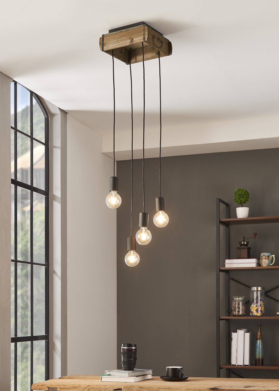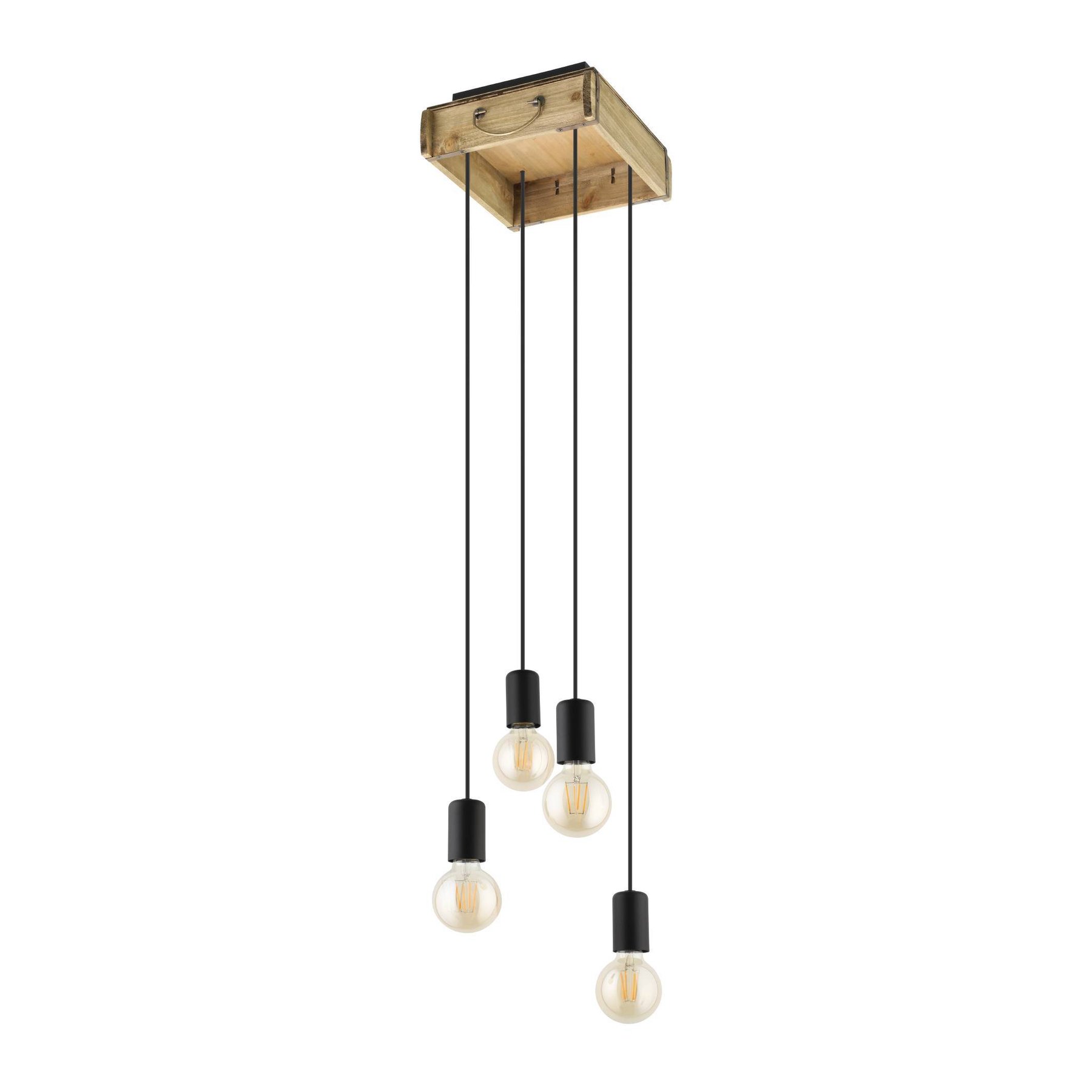 Stilvolle Pendelleuchten aus Holz in brauner Farbe und Stahl in schwarzer Farbe. An der Decke hängt eine Holzkiste, an der schwarze Steckdosen hängen. Bestücken Sie sie mit interessanten Retro-Glühbirnen, die die Einzigartigkeit dieser Lampe noch verstärken. |