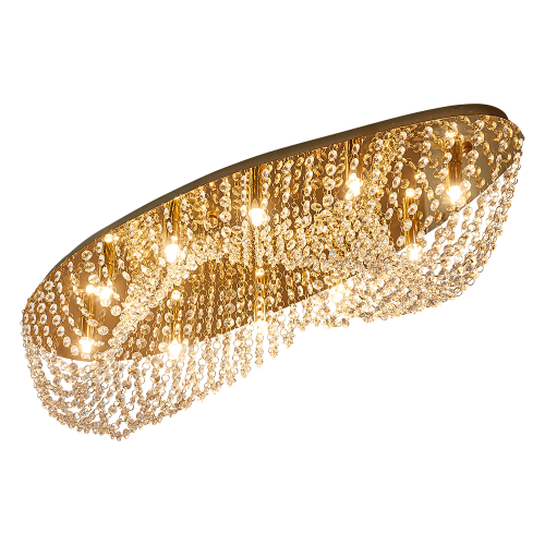 Moderne Deckenleuchte geeignet für Wohnzimmer, Schlafzimmer, aber auch Flure. Es besteht aus goldfarbenem Metall und klaren Kristallen. Wenn es angezündet wird, wird das Licht von den Kristallen reflektiert und funkelt wunderschön, wodurch ein luxuriöser Eindruck entsteht. |