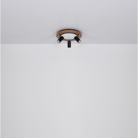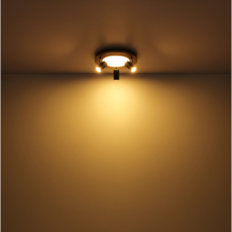 Deckenleuchten aus Metall in eleganter mattschwarzer Farbe, Sperrholz in Holzimitation und Kunststoff in Opalfarbe. Die zentrale Beleuchtung besteht aus einer integrierten LED-Quelle, die nicht ausgetauscht werden kann, und zusätzlichen Spots mit GU10-Gewindelampen, die austauschbar sind. Es wird empfohlen, nur LED-Lampen zu verwenden. Die Lampen verfügen zudem über eine Memory-Funktion der letzten Einstellung und über den Wandschalter lässt sich die Beleuchtung in drei Stufen regulieren. |