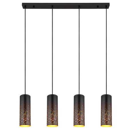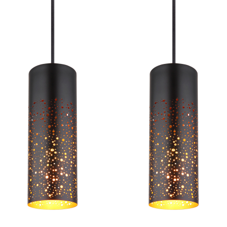 Moderne Kronleuchter eignen sich für die Küche oder das Esszimmer über dem Esstisch oder der Kücheninsel, aber auch für das Wohnzimmer. Sie bestehen aus Metall in einem eleganten Mattschwarz- und Goldton, die Lampenschirme sind an einem Textilkabel aufgehängt. Der Schirm ist perforiert, was bei Beleuchtung sehr effektvoll aussieht. |