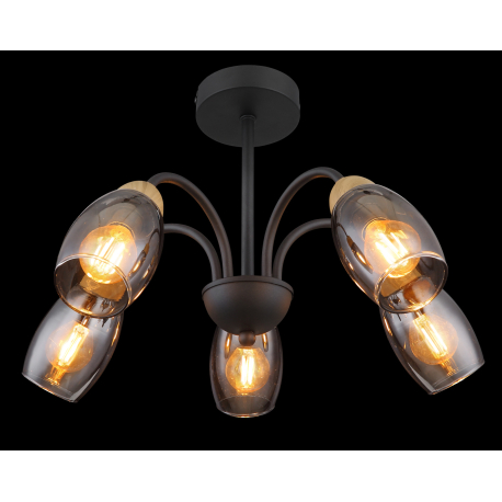 GL-60297-5D Stropní svítidlo kov černý matný, sklo kouřové, kov imitace dřeva, Ø:470mm, V:290mm, bez žárovek 5xE14 25W 230V -