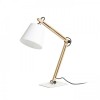 Tischleuchte mit Holzkörper und Textilschirm. Der Arm der Lampe ist verstellbar. Der Sockel der Lampe besteht aus Metall. |