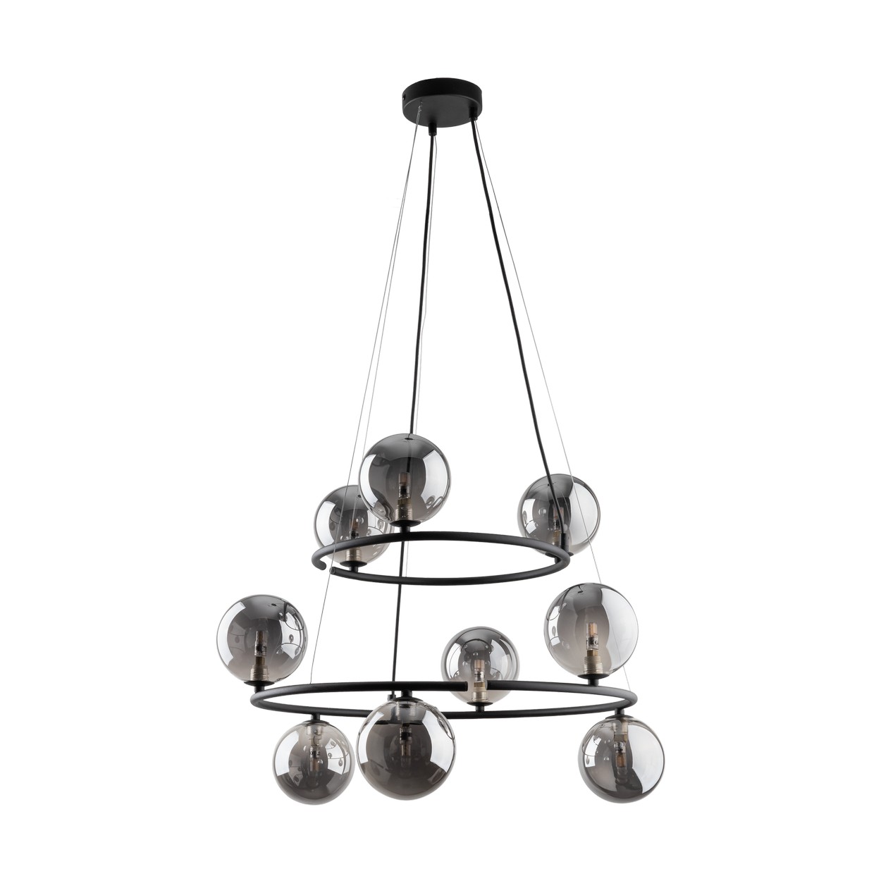 Interessante Kronleuchter aus Metall, Kunststoff und Glas. Es hat ein luxuriöses Gefühl. Sie werden ein interessantes Element in Ihrem Interieur bilden. Auf dem schwarzen Sockel sind schwarze Glaskugeln platziert. |
