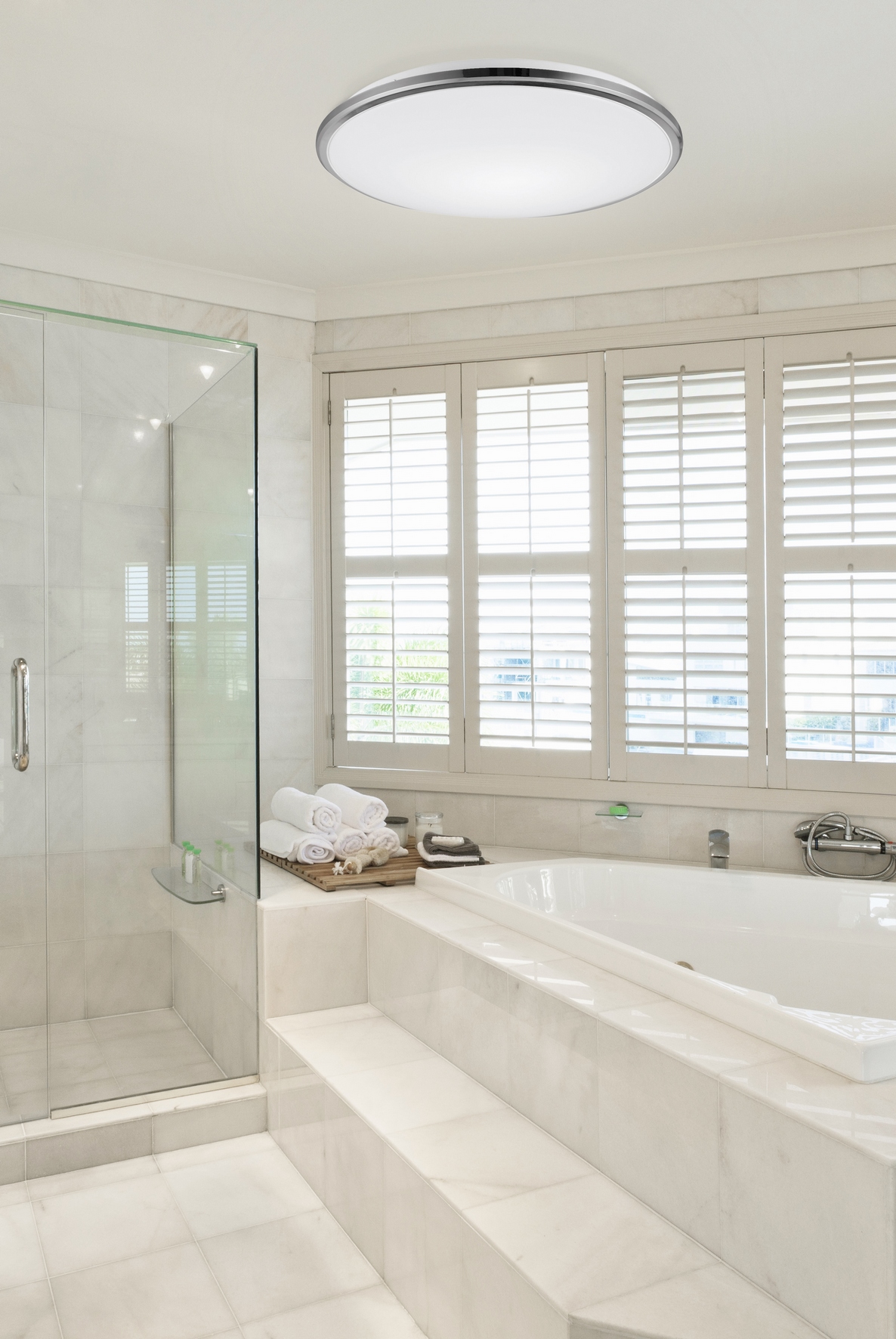 Elegante Deckenleuchte aus Metall und Kunststoff. Der Metallsockel ist verchromt und der Kunststoffdiffusor ist weiß. Dank IP 44-Schutz ist die Lampe für Feuchträume wie Badezimmer, Toiletten, aber auch für Flure, Schlafzimmer usw. geeignet. Möglichkeit zur Umstellung der Lichtfarbe 3000K/4000K/6500K.