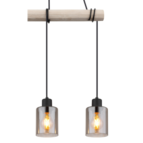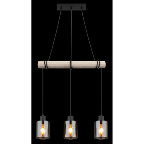 GL-15465-3H Závěsné svítidlo, kov černý, dřevo přírodní barva, sklo kouřová barva, kabel na omotání, Dx?xV:500x100x1400mm, bez žárovek 3xE27, max. 40W 230V -