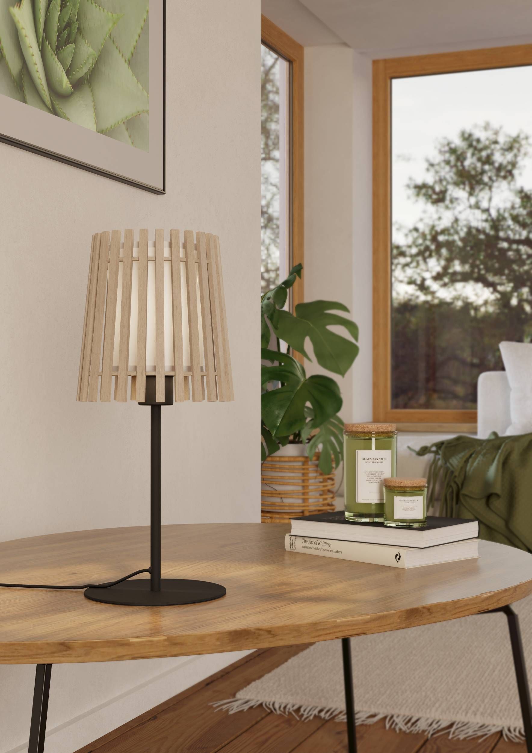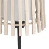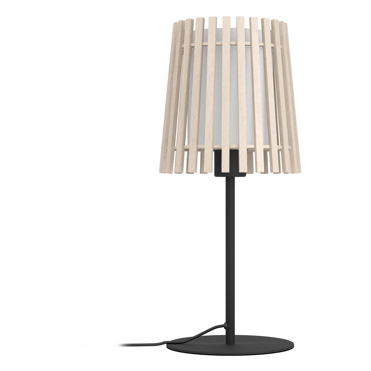 Die Fattoria-Lampen haben ein schwarzes Stahlbein und einen Holz- und Textilschirm in Natur und Weiß.