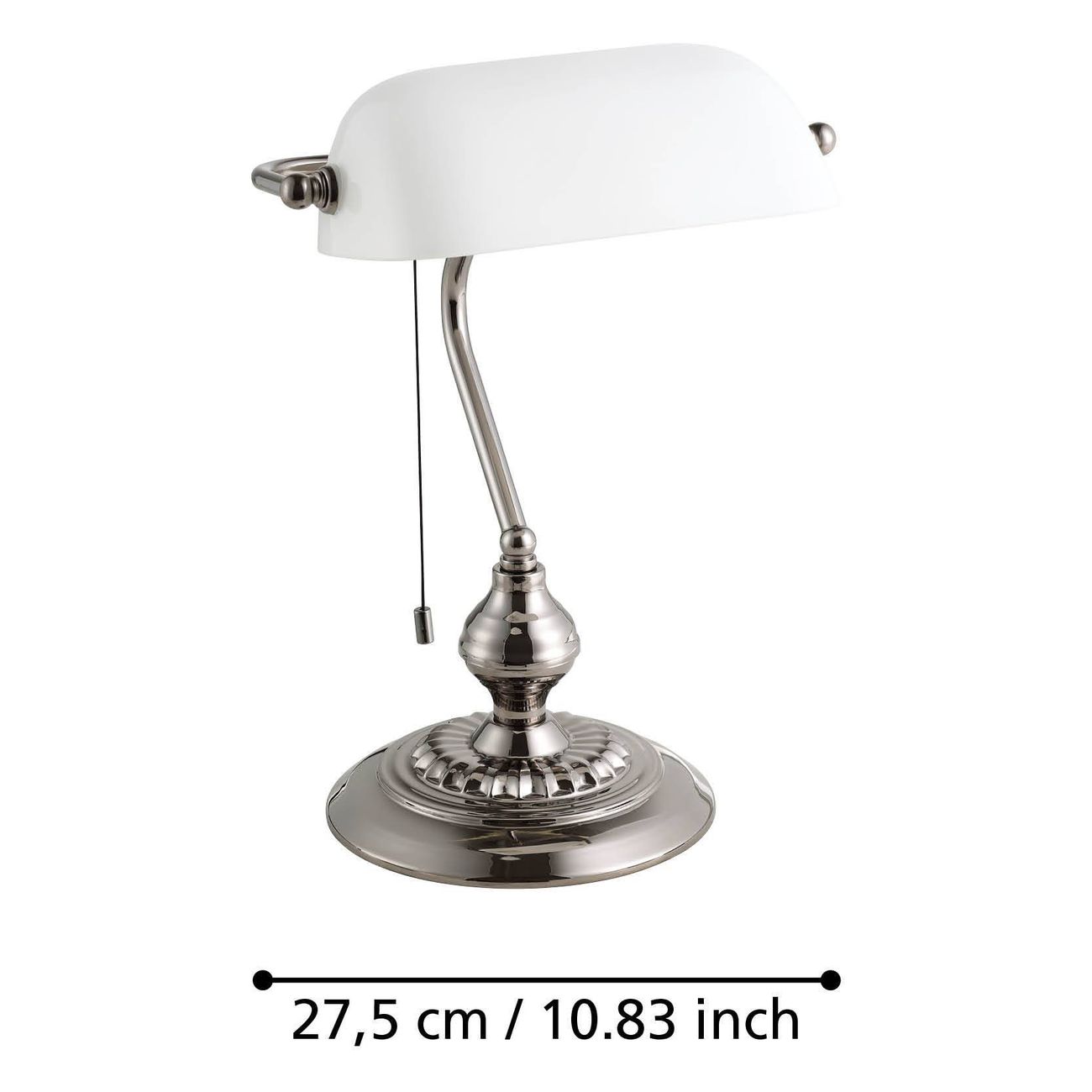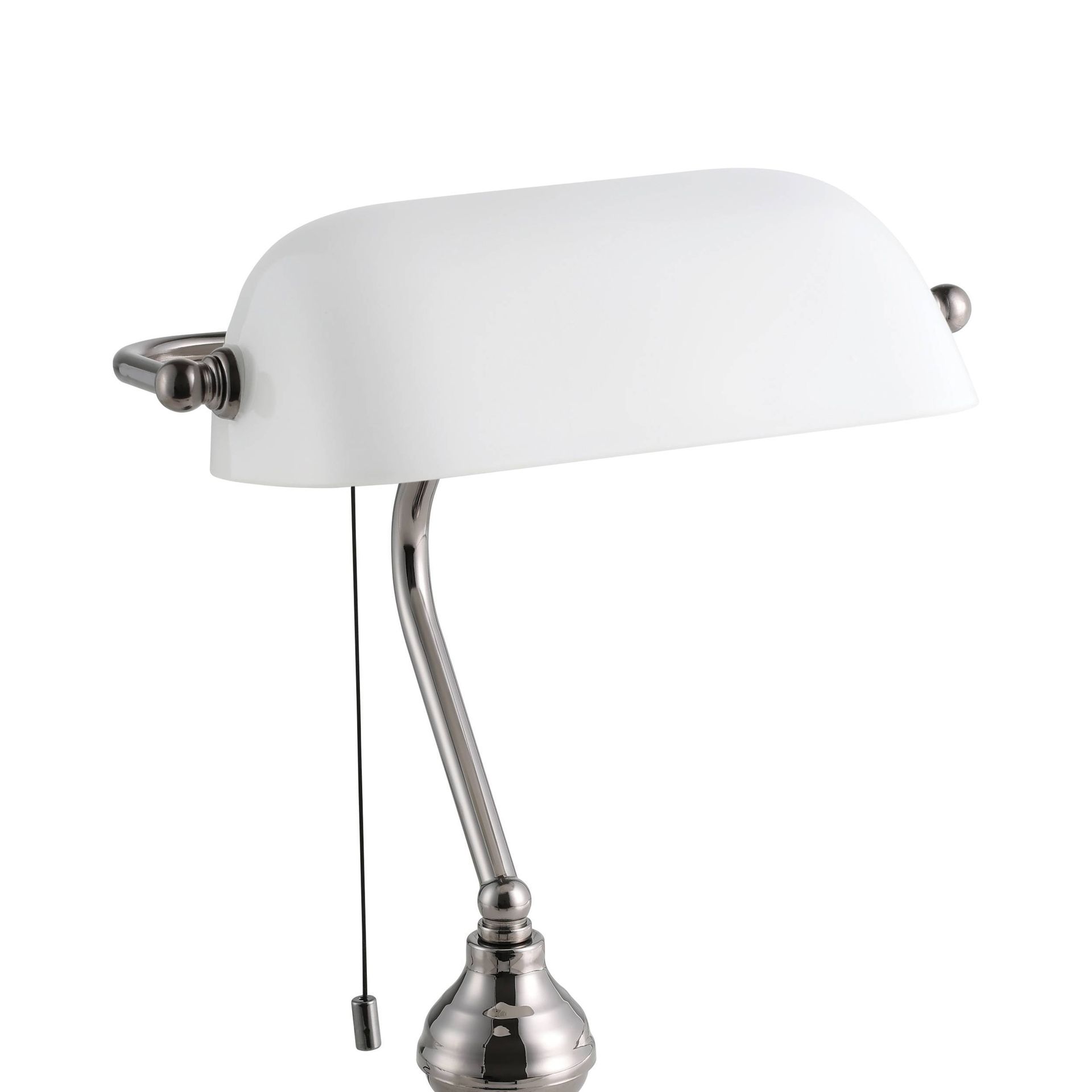 Tischlampe, geeignet für Büros und Arbeitszimmer. Bankstil. Sie besteht aus Metall in der Farbe Nero Nickel matt und der Schirm besteht aus weiß satiniertem Glas. Mit Ein-/Ausschalter. |