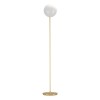 Die edlen Leuchten bestehen aus Stahl in gebürstetem Messing und die Lampenschirme bestehen aus Glaskugeln in einer matten Opalfarbe. |