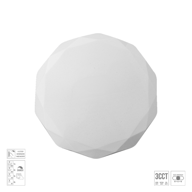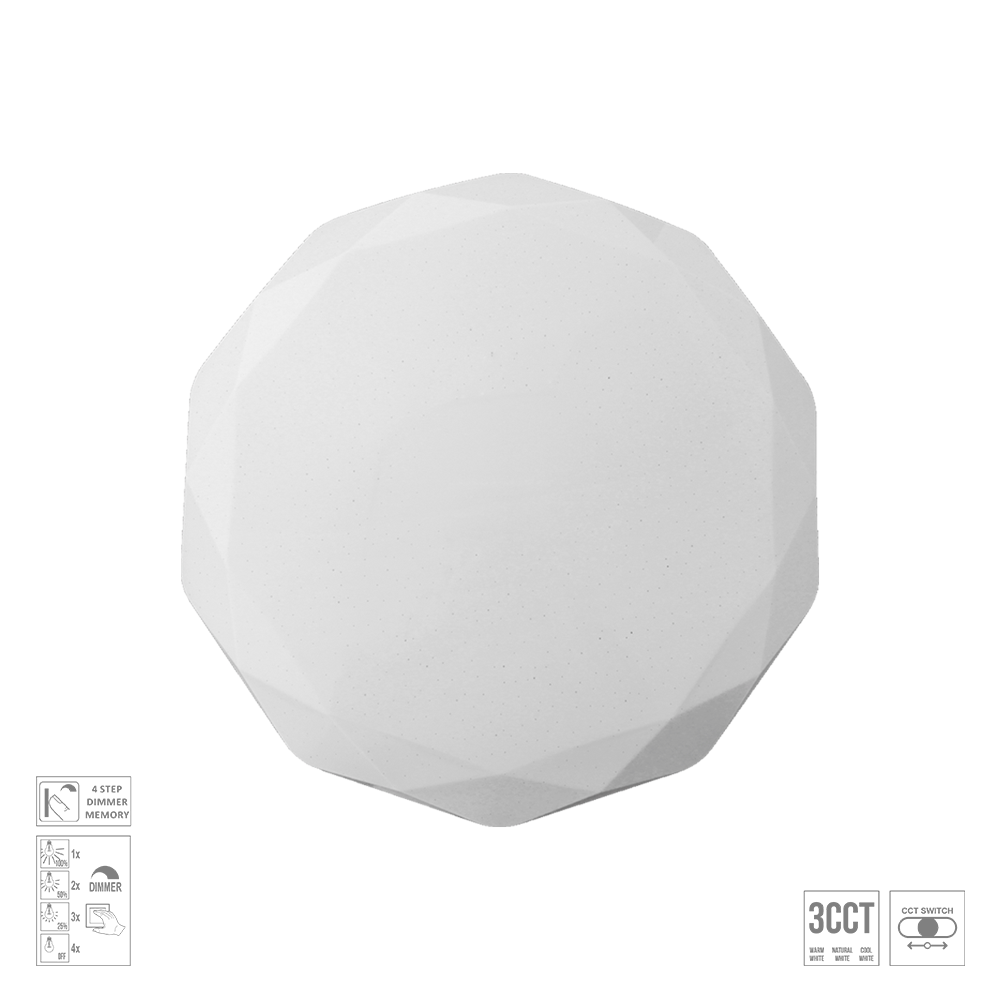 Die Iridio-Deckenleuchten bestehen aus weißem Metall und Acryl. Dank des sanft schimmernden Lichteffekts eignen sie sich perfekt für Kinderzimmer und moderne Einrichtungen. Die Leuchte hat eine Lebensdauer von 20.000 Stunden. Die Farbtemperatur ist von 3000 K bis 6500 K einstellbar. Die zuletzt gewählte Lichteinstellung kann gespeichert werden.