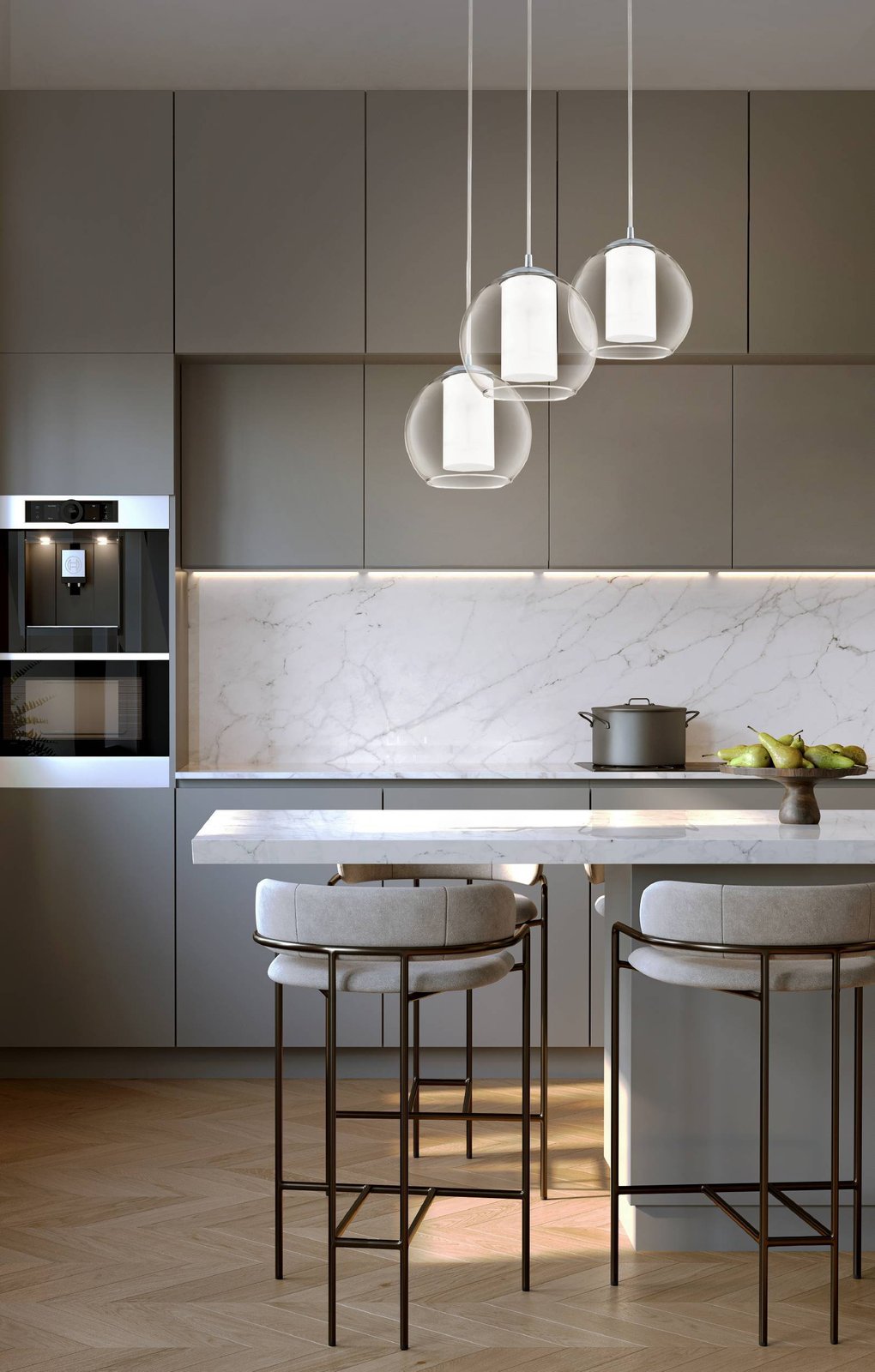 Einfache, aber sehr moderne Kronleuchter. Sie bestehen aus chromfarbenem Stahl und der Schirm besteht aus klarem und milchig weißem Glas. Es passt perfekt in die Küche über den Esstisch oder über die Kücheninsel. |