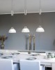 Ciekawy żyrandol pasujący do kuchni nad stołem lub wyspą kuchenną. Wykonany jest ze stali w kolorze matowego niklu oraz trzech odcieni szkła alabastrowego. Lampa świeci ciepłą białą barwą i nie ma możliwości jej przyciemnienia.