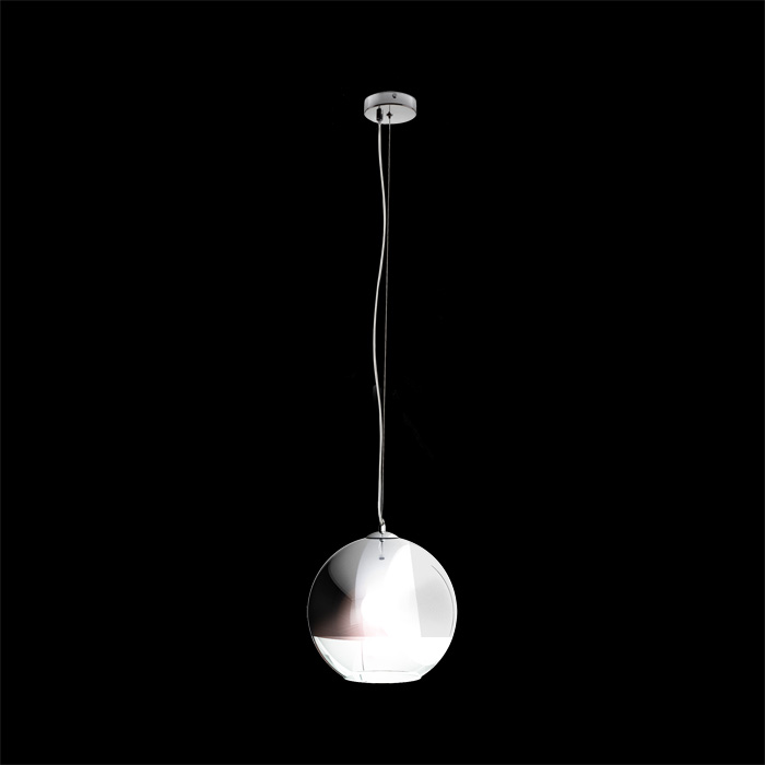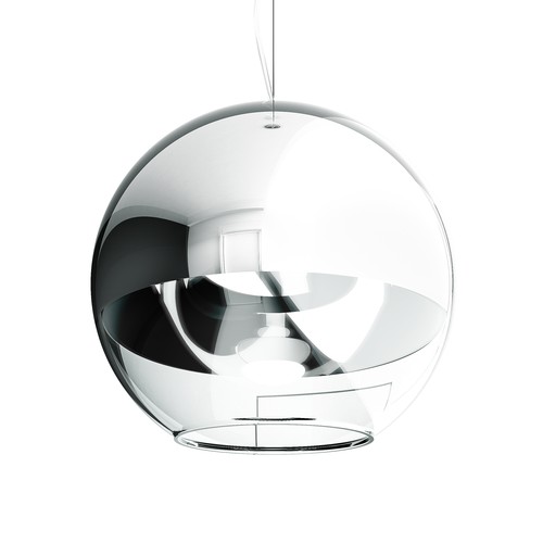 Hängeleuchte mit mundgeblasenem Glasschirm. Das Erscheinungsbild des Farbtons wird durch ein spezielles Verfahren erreicht, bei dem eine dünne Metallschicht auf das Glas aufgebracht wird. Der untere Teil des Schirms ist ohne Chromoberfläche gebogen und besteht aus klarem Glas. |