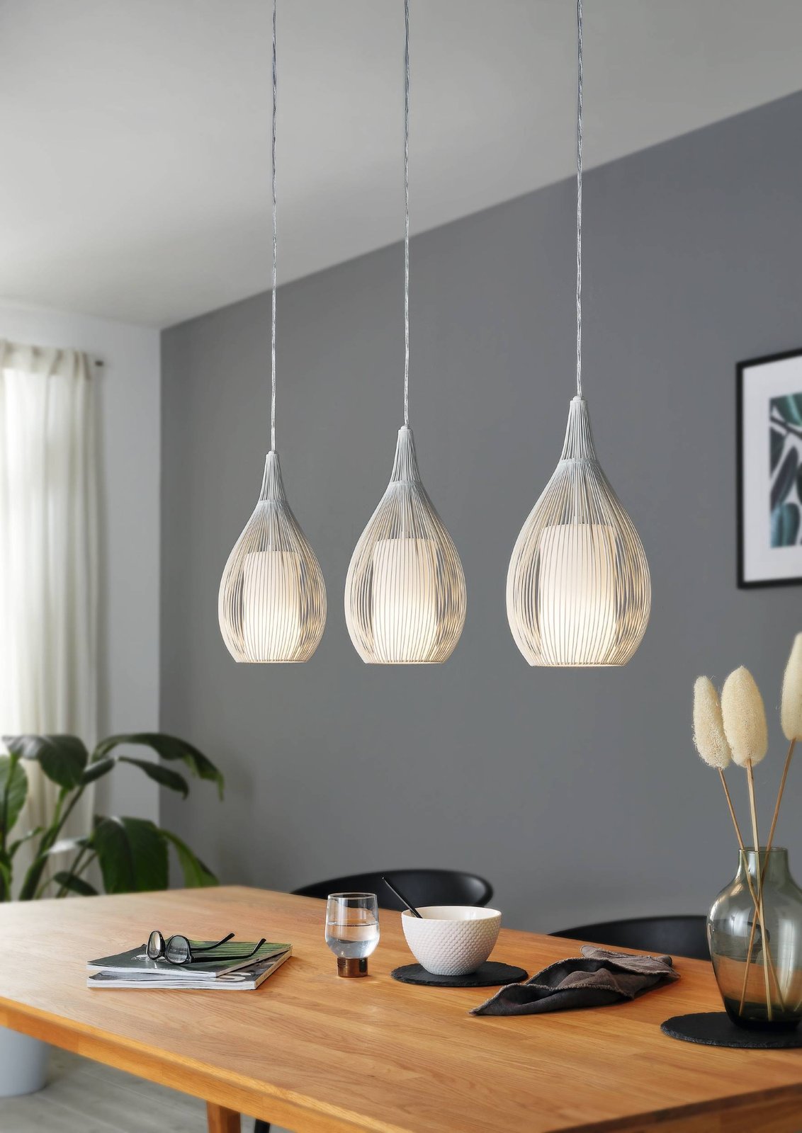 Razoni-Pendelleuchten eignen sich für alle modernen Innenräume. Es eignet sich nicht nur für Küchen und Esszimmer, sondern auch für Wohnzimmer. Der Sockel besteht aus Stahl und der Schirm hat eine interessante Tropfenform aus Stahldrähten und im Inneren des Tropfens befindet sich ein Glaszylinder. Nach dem Anzünden sieht die Lampe sehr effektvoll aus. |