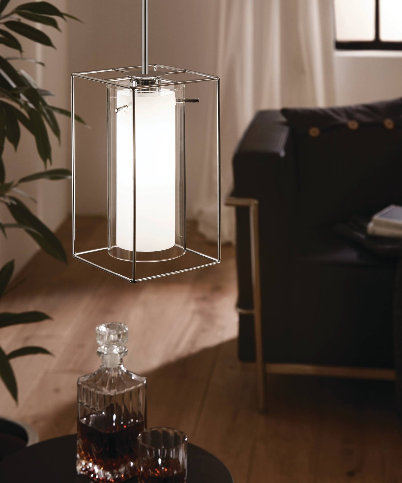 Interessante und stilvolle Pendelleuchten aus chromfarbenem Stahl und klarem und weißem Glas. Diese Kronleuchter können auch mit einer Designer-Glühlampe ausgestattet werden, die das Gesamtbild der Leuchte aufwertet. |