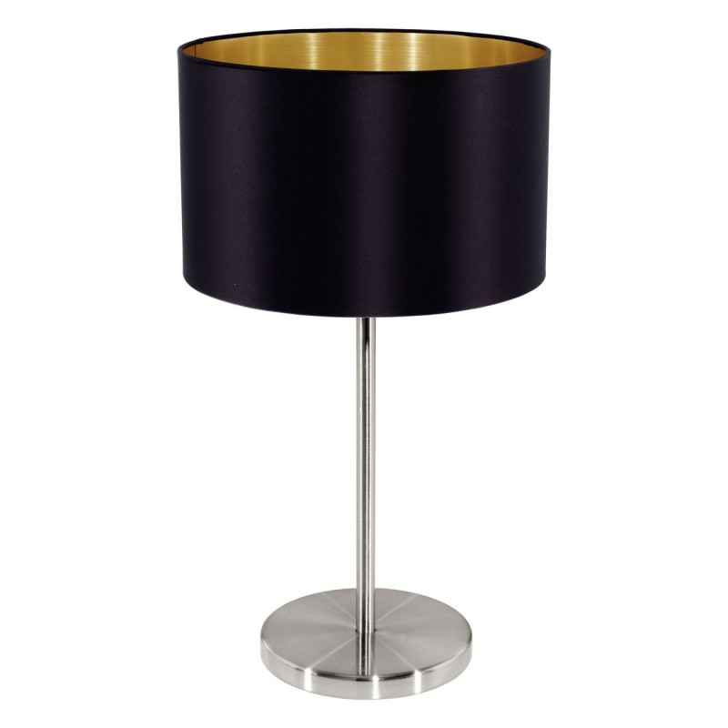Maserlo sind Lampen in modernem Design. Sie bestehen aus Stahl in der Farbe Mattnickel und der Lampenschirm ist aus Textil, innen goldfarben und außen schwarz. |