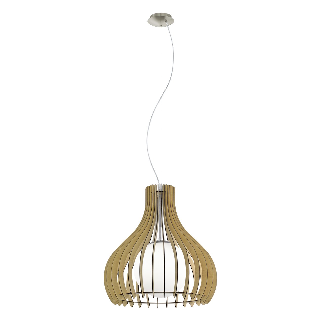 Moderne Pendelleuchten geeignet für Wohnzimmer, Küche, Esszimmer, aber auch Schlaf- und Kinderzimmer. Sie bestehen aus Stahl in der Farbe Mattnickel und aus Holzlatten in der Farbe Ahorn. |