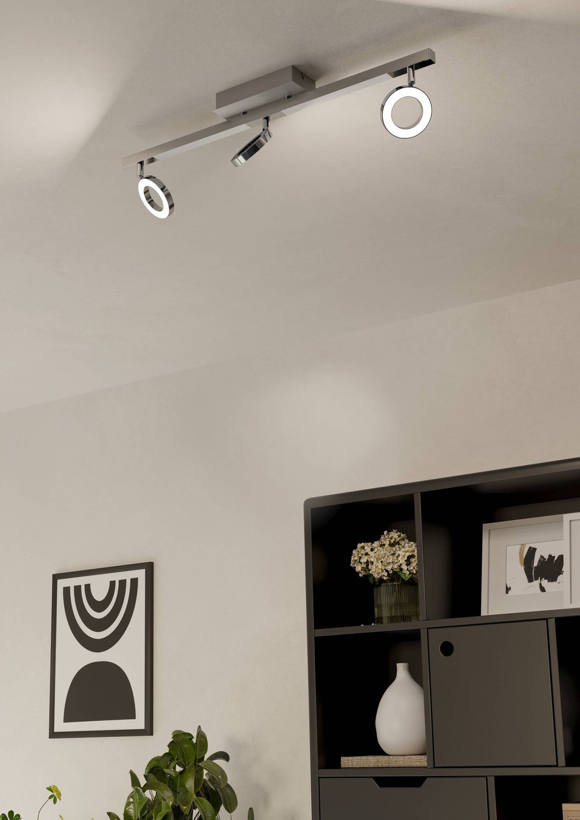 Cardillio 1 LED sind interessante Strahler, die für moderne Innenräume geeignet sind. Sie bestehen aus Aluminium und Stahl in Chromfarbe kombiniert mit mattem Nickel. Die Kunststoffteile der Lampe sind weiß. Die einzelnen Leuchtenköpfe sind neigbar, sodass Sie das Licht dorthin streuen können, wo Sie es benötigen.
