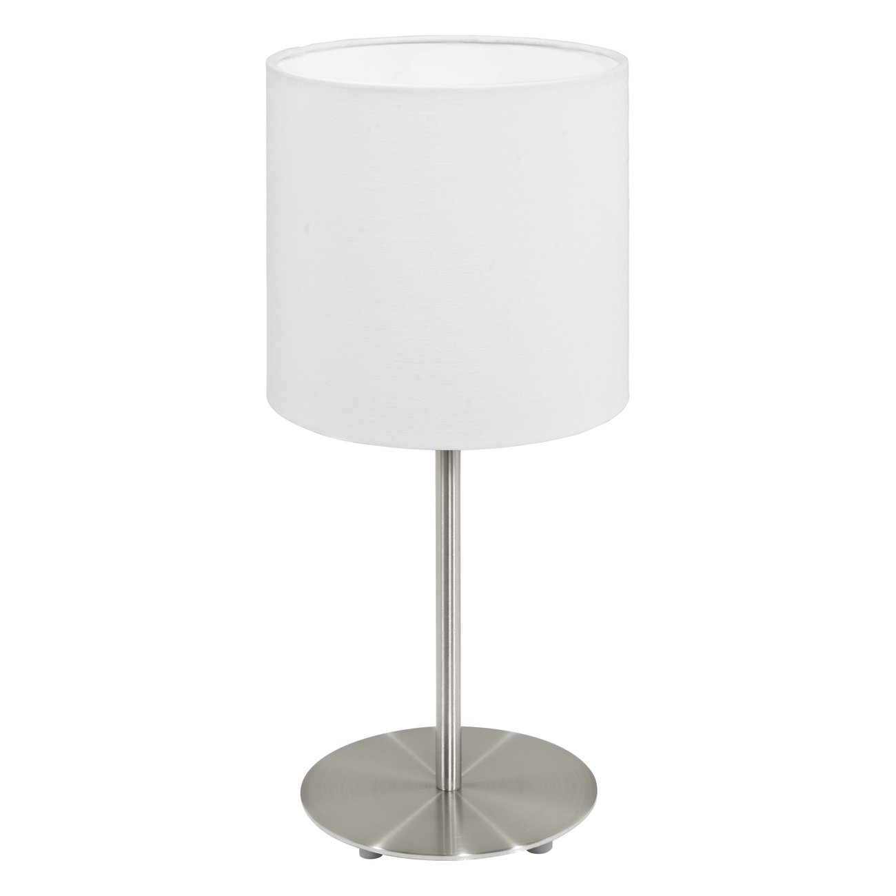 Schlichte Lampen passend für das Schlafzimmer auf dem Nachttisch oder im Wohnzimmer auf der Kommode. Sie bestehen aus Stahl und Textil.